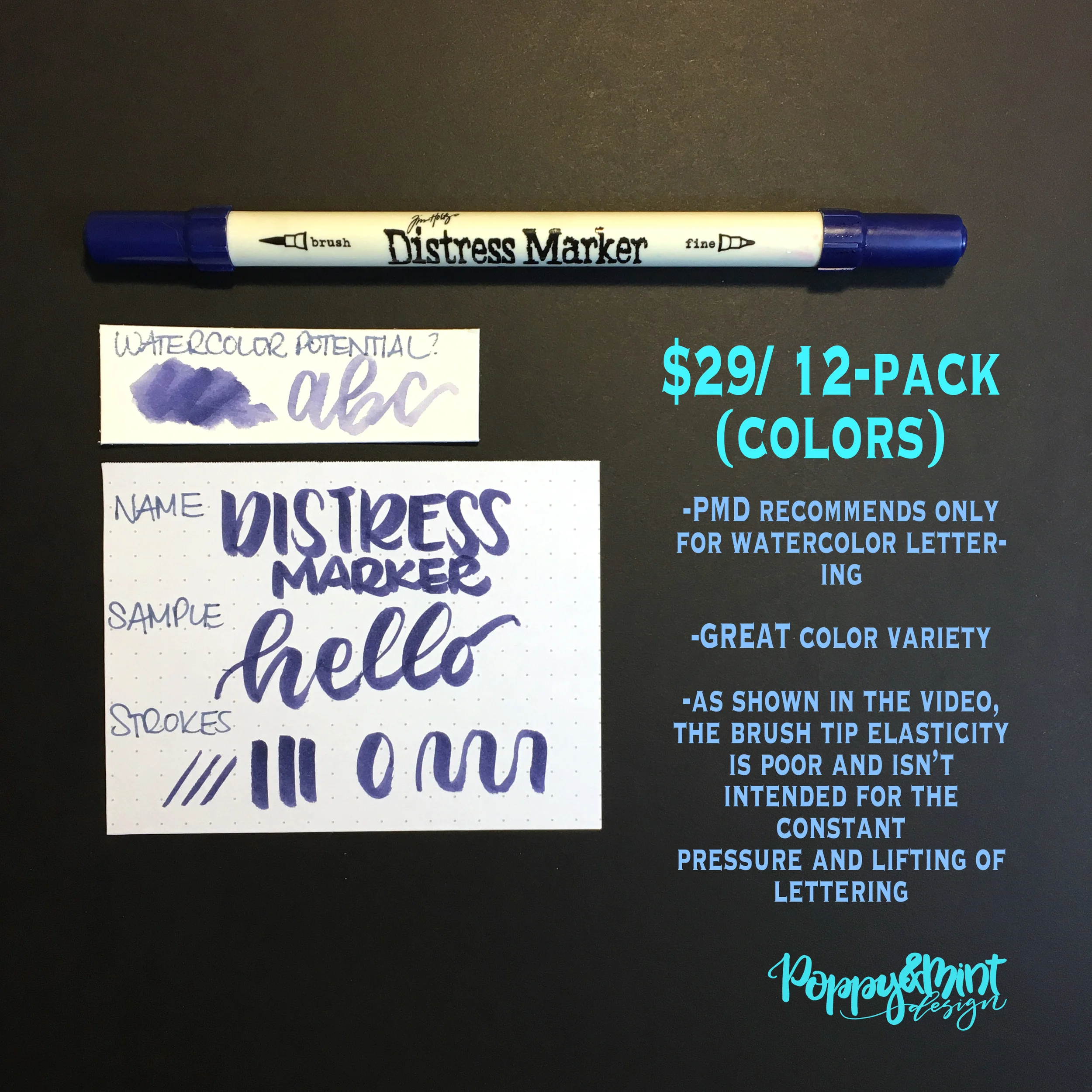 So while I don't recommend you purchasing them for lettering - they are AWESOME for watercolor (in addition to their counterparts, Distress Ink pads). I often use these by scribbling some color out onto an acrylic block (or a Tombow Blending Palette) and then picking up the pigment with a water brush to achieve the watercolor lettering look.