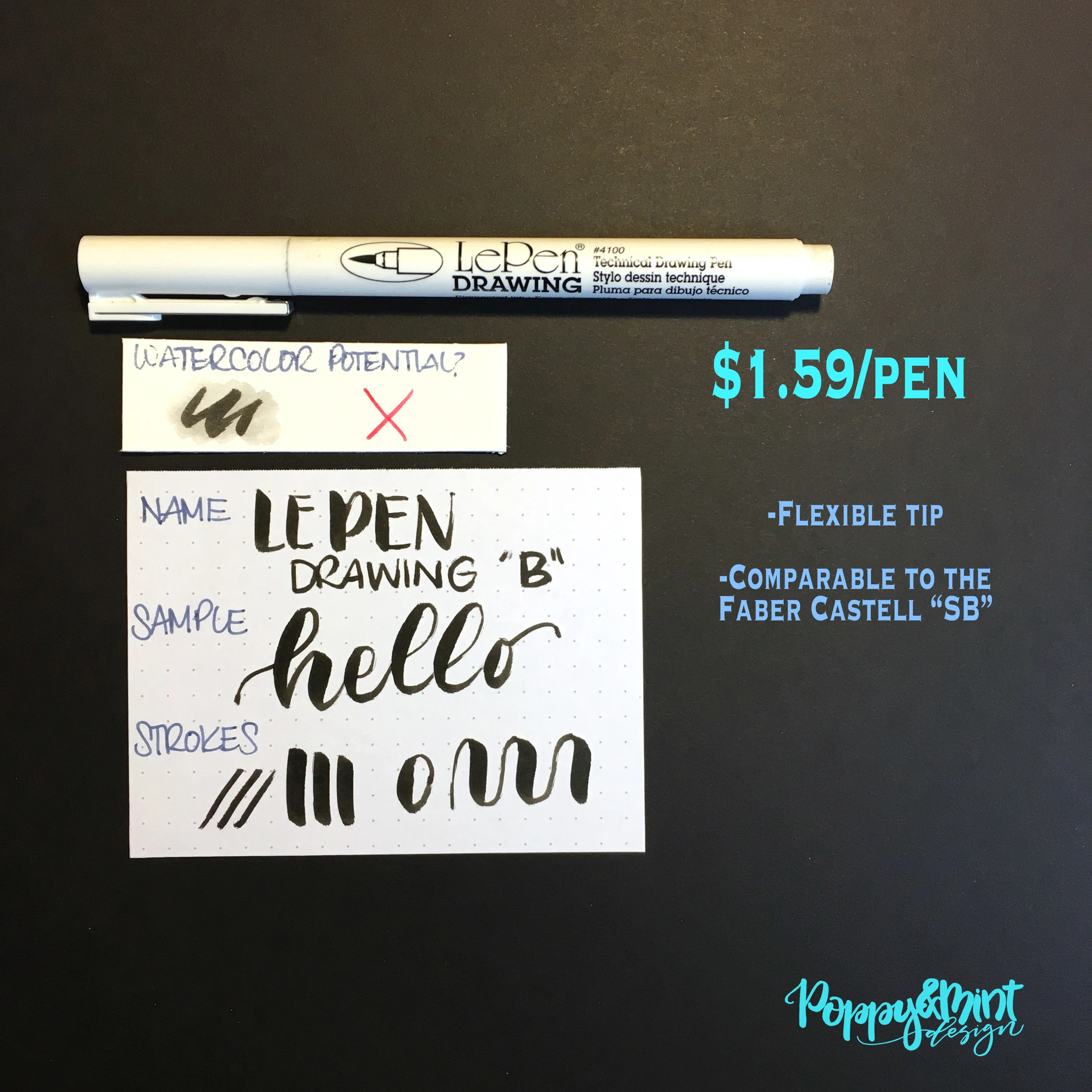 The Le Pen "B" is very similar in feel to the Faber Castell "SB" and the Copic Multiliner "BS." They all have longer tips that are more flexible than most in this pen roundup. The Copic Multiliner is alcohol based, however, and "Copic safe."