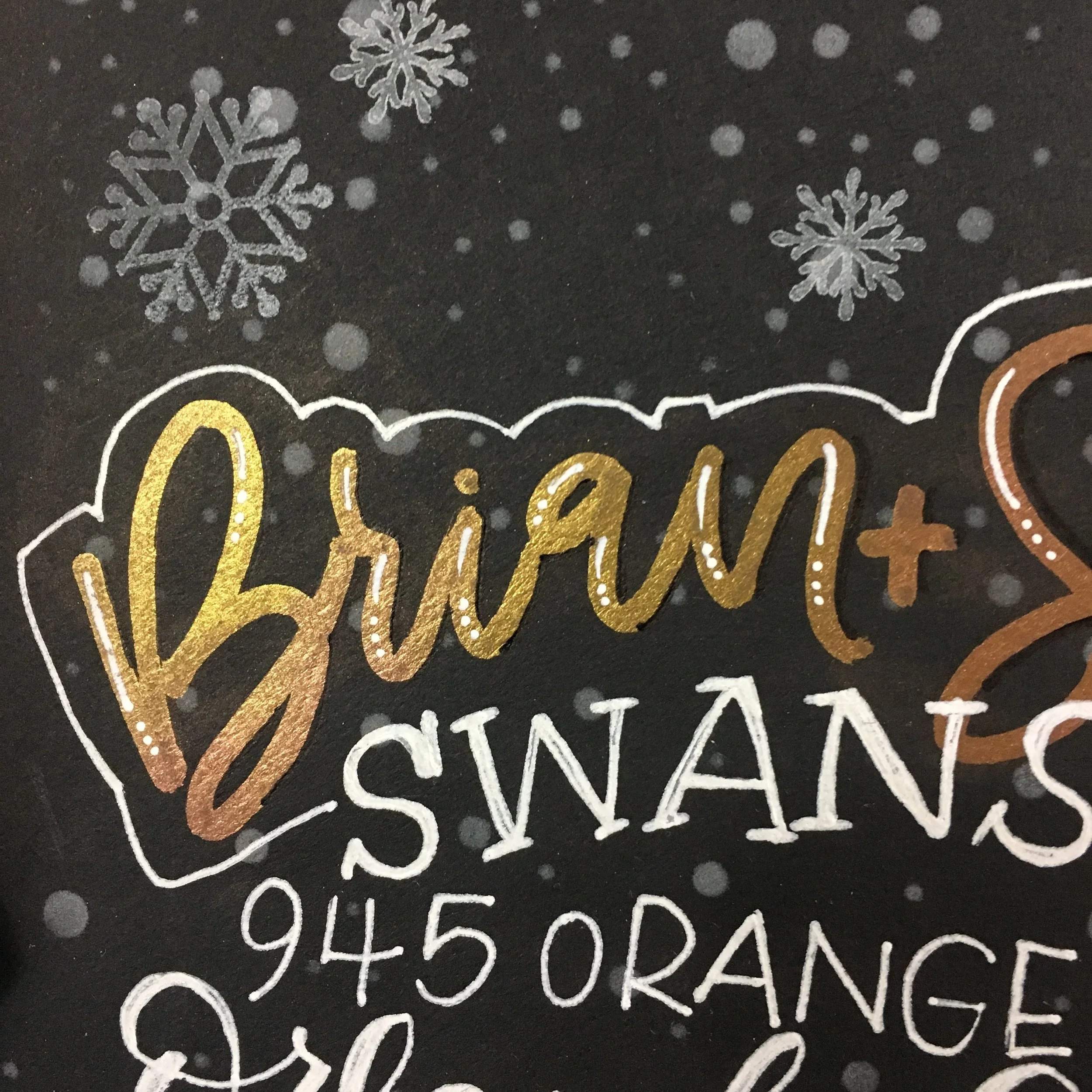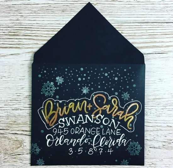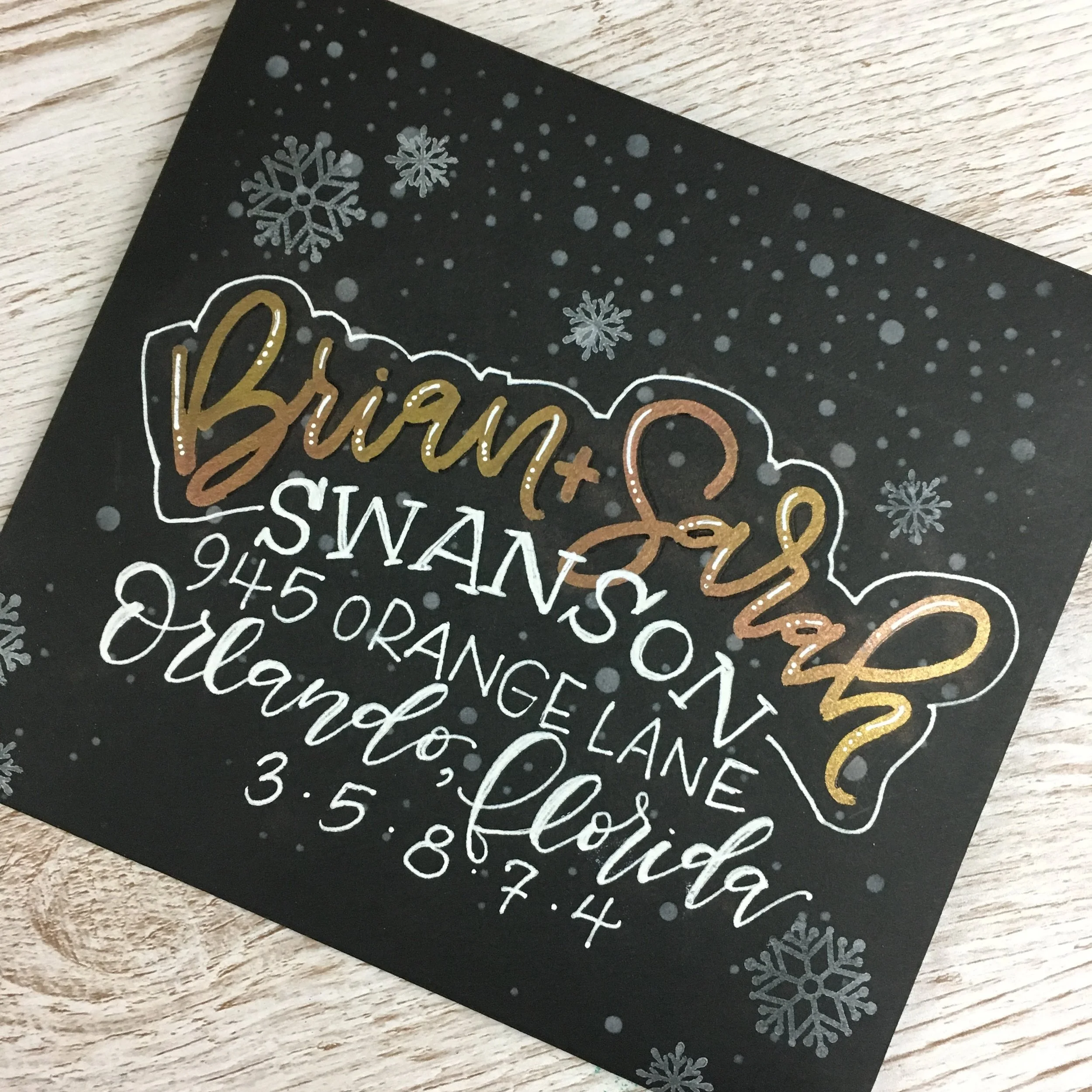 11. To write the address and some of the finishing highlights, I used the Uniball Signo Broad White -my favorite white gel pen! I kept the last name on the same arc as the first names and then the 1st line of the address on a horizontal line beneath it. After writing those out in a Sans Serif style, I decided to add the Serif to the last name to make it bit more distinguished in comparison. I went with a script for the city and state and applied a "faux calligraphy" technique to add the thick downstrokes in since a gel pen does not have a brush tip to do this for us. Finally, I chose to space the zip code out with dots between each number, centered under the City/State.