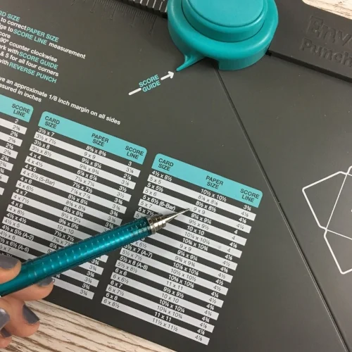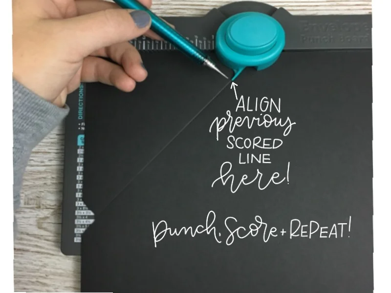 Now, all you have to do is rotate your cardstock 90 degrees CCW, align the previously scored line with the teal pointed piece at the base of the Punch Button and then Punch, Score and Repeat!