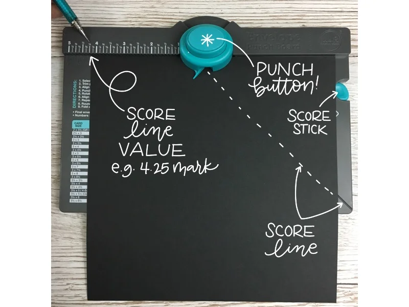 Here's is a screen shot of what this means. Place the 9"x9" sheet adjacent to the top edge of the envelope punch and align it with the value in the Score Line Column. My paper is aligned here to the 4.25 mark.