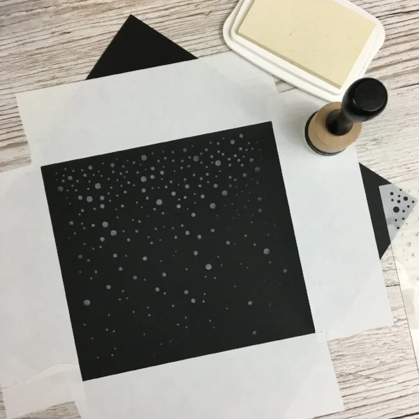 2. Align the stencil so that you are happy with the placement of where the snowfall will end up and adhere temporarily with a piece of washi tape to keep in place as your add ink. Don't worry about putting ink down in the area where the stamps will be because covering it up won't be a problem!
